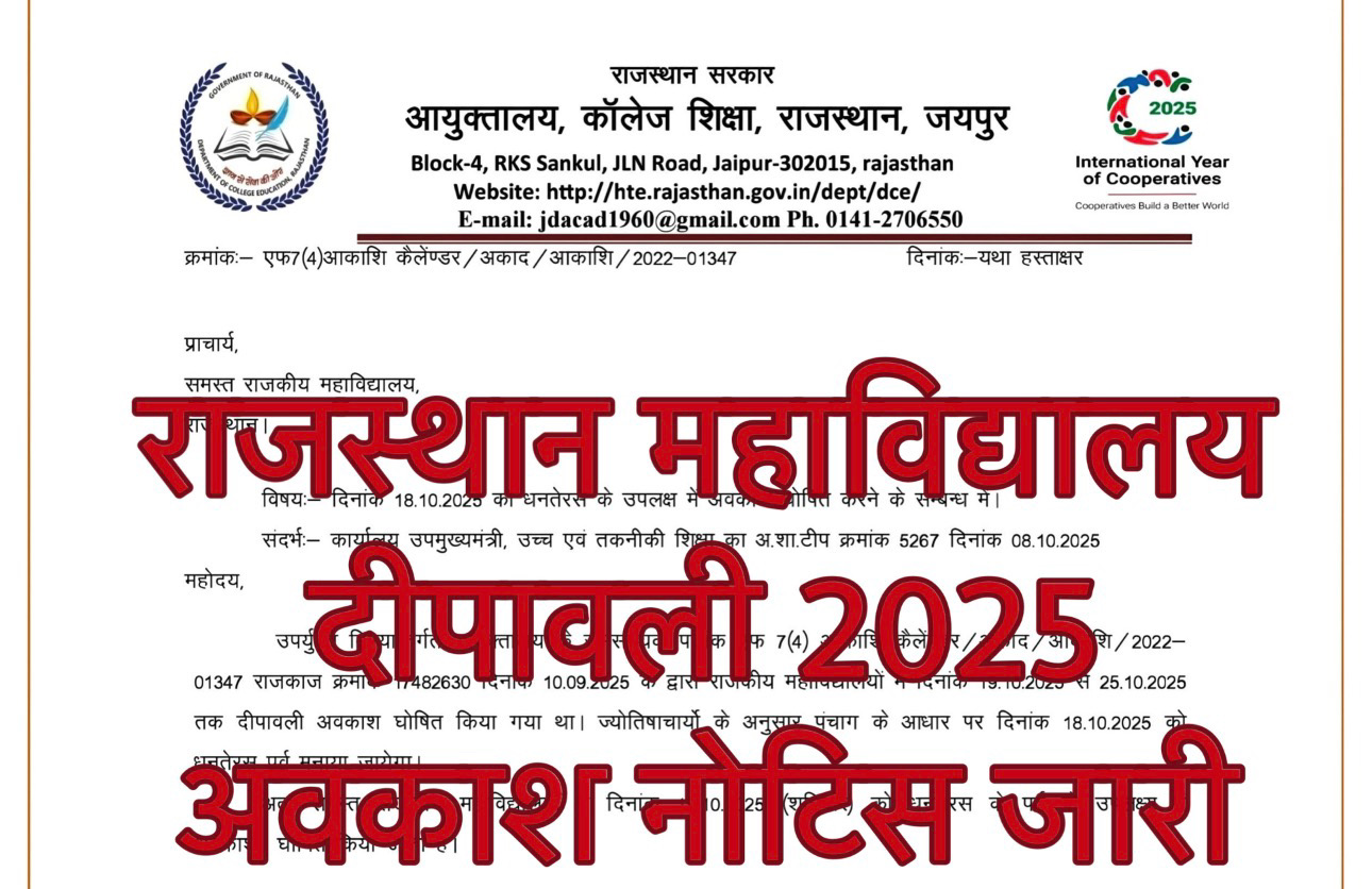 राजस्थान सरकार, आयुक्तालय, कॉलेज शिक्षा, जयपुर ने आधिकारिक रूप से घोषणा की है कि 18 अक्टूबर 2025 से 25 अक्टूबर 2025 तक (समेत) सभी राजकीय महाविद्यालयों में दीपावली अवकाश रहेगा। नीचे पत्र की मुख्य बातें, तिथियाँ, निर्देश और अक्सर पूछे जाने वाले प्रश्न दिए गए हैं।