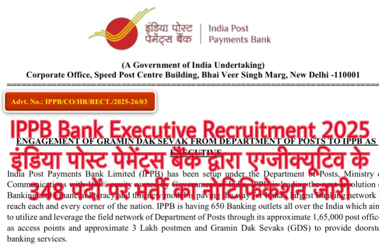 IPPB Bank Executive Recruitment 2025: इंडिया पोस्ट पेमेंट्स बैंक द्वारा एग्जीक्यूटिव के 348 पदों पर भर्ती का नोटिफिकेशन जारी